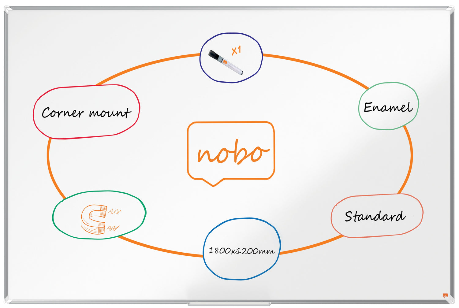 Denne moderne magnetiske standard whiteboardtavle er med sin slanke aluminiumsramme og stilfulde plasthjørner den perfekte tilføjelse til ethvert kontor, skole eller hjemmearbejdsplads. Den holdbare emaljeoverflade giver overlegen sletbarhed og modstår skygger, ridser og buler, hvilket gør den ideel til hyppig brug. Denne store whiteboardtavle har en glat overflade, der gør det nemmere at skrive og sikrer klar, tydelig og markant kommunikation til effektivt samarbejde. Den er designet med et skjult traditionelt gennemgående hjørnemonteringssystem og kan nemt installeres i enten liggende eller stående retning. Denvægmonterede whiteboardtavle er magnetisk, så det er nemt at fastgøre noter, fotos og vigtig information, og der medfølger en stor pennebakke, der nemt sættes på whiteboardtavlen, til opbevaring af whiteboardmarkere og magneter. Vores Premium Plus whiteboards bærer stolt det globalt respekterede EU Ecolabel, der anerkender miljømæssig fokus og sikrer reduceret påvirkning i hel