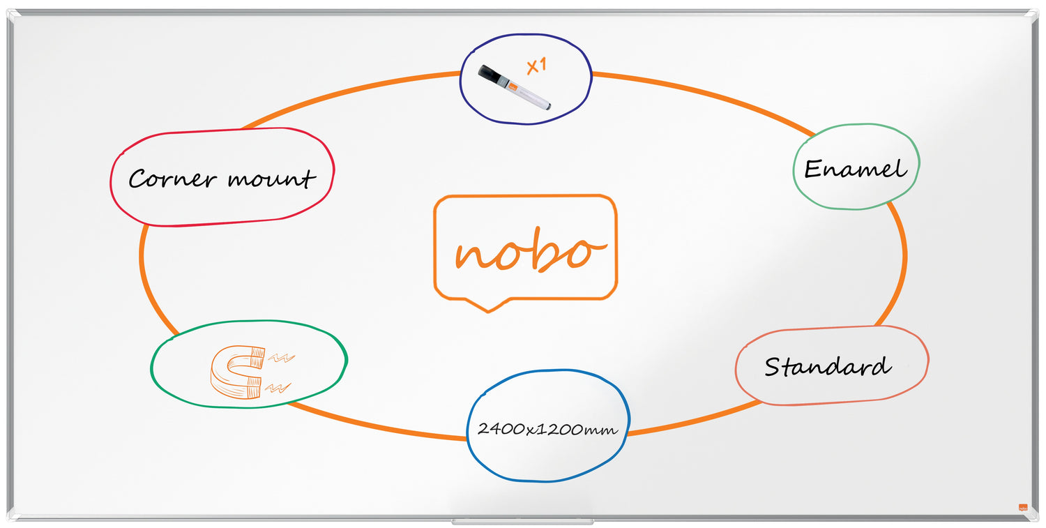 Denne moderne magnetiske standard whiteboardtavle er med sin slanke aluminiumsramme og stilfulde plasthjørner den perfekte tilføjelse til ethvert kontor, skole eller hjemmearbejdsplads. Den holdbare emaljeoverflade giver overlegen sletbarhed og modstår skygger, ridser og buler, hvilket gør den ideel til hyppig brug. Denne store whiteboardtavle har en glat overflade, der gør det nemmere at skrive og sikrer klar, tydelig og markant kommunikation til effektivt samarbejde. Den er designet med et skjult traditionelt gennemgående hjørnemonteringssystem og kan nemt installeres i enten liggende eller stående retning. Den vægmonterede whiteboardtavle er magnetisk, så det er nemt at fastgøre noter, fotos og vigtig information, og der medfølger en stor pennebakke, der nemt sættes på whiteboardtavlen, til opbevaring af whiteboardmarkere og magneter. Vores Premium Plus whiteboards bærer stolt det globalt respekterede EU Ecolabel, der anerkender miljømæssig fokus og sikrer reduceret påvirkning i hel