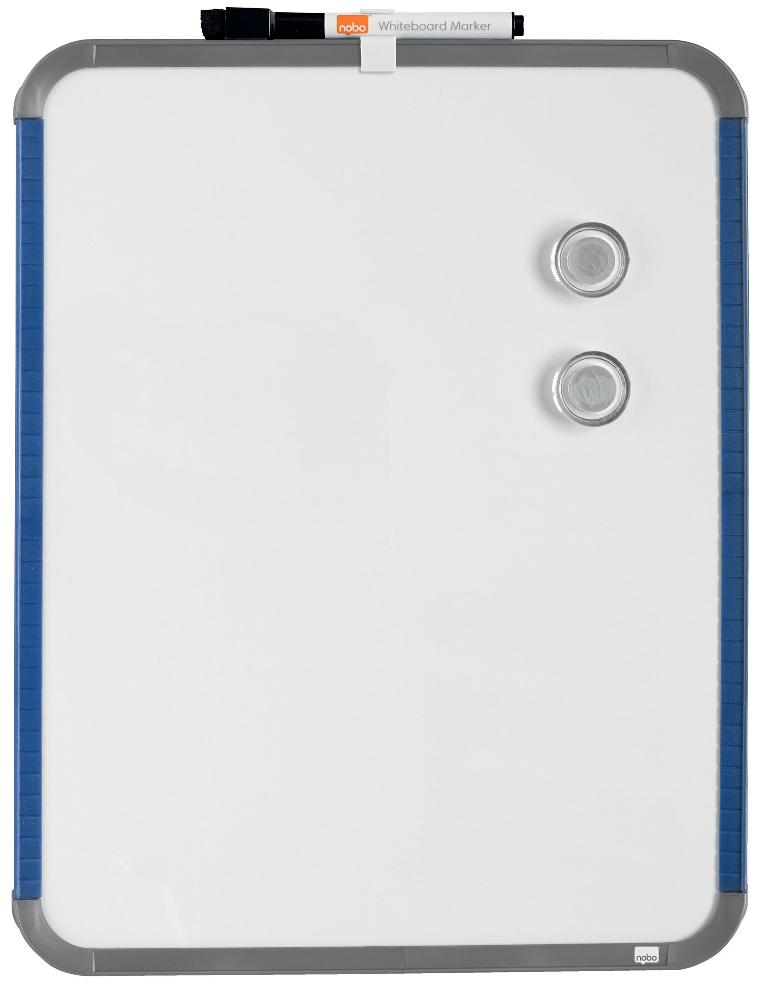 Der medfølger en Nobo dry wipe marker og to magneter samt selvklæbende puder til vægmontering.